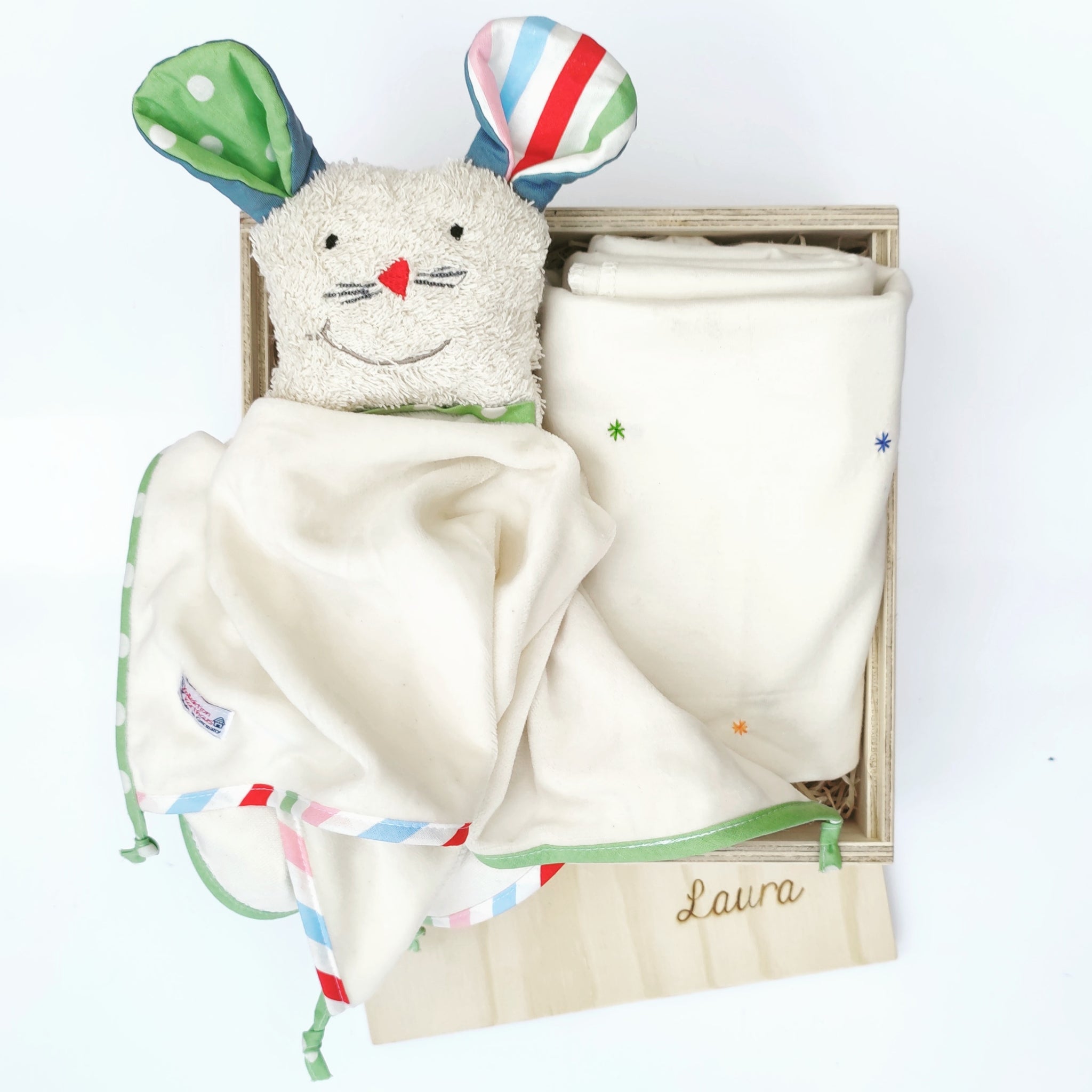 • Lade das Bild in den Galerie-Viewer, Hier siehst du ein beiges Stofftier mit bunten Ohren und einen Körper aus einem kleinem Tuch in einer Holzbox liegend. Neben dem Stofftier liegt eine zusammengefaltetete Decke mit bunten Sternchen eingehnäht.