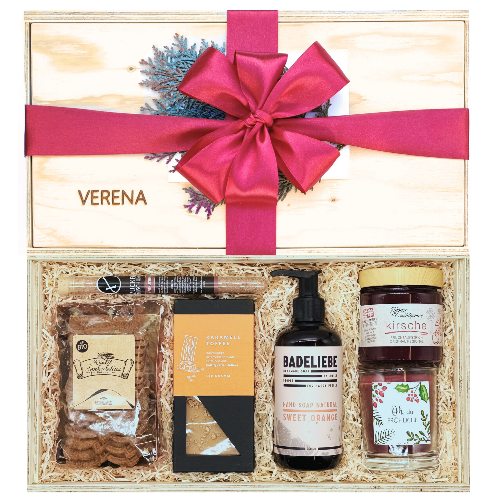 Unsere Winterzauber Geschenkbox beinhaltet köstliche weihnachtliche Zuckermischung, Bio Früchtetee, Schokoladentafel, Sweet Orange Handseife, weihnachtliche Duftkerze, weihnachtliche Seife und eine Schokoladentafel. Auf dem Bild sieht du oben eine geschlossene Box mit Namens-Gravur und grüner Schleife verpackt. Darunter siehst du die gleiche Boxen offen ohne Decke mit den genannten Produkten in die Box gelegt.